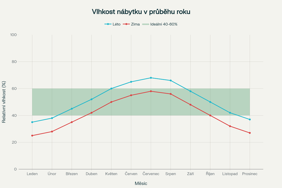 Podle odborných zdrojů je pro české klimatické podmínky ideální relativní vlhkost pro dřevěný nábytek mezi 40% a 60%.  V tomto rozmezí dřevo udržuje stabilní obsah vlhkosti, což minimalizuje riziko expanze nebo kontrakce, přičemž v topné sezóně je důležité věnovat zvýšenou pozornost udržování dostatečné vlhkosti. Toto jsou ostatně optimální hodnoty vlhkosti vhodné i pro lidské zdraví.