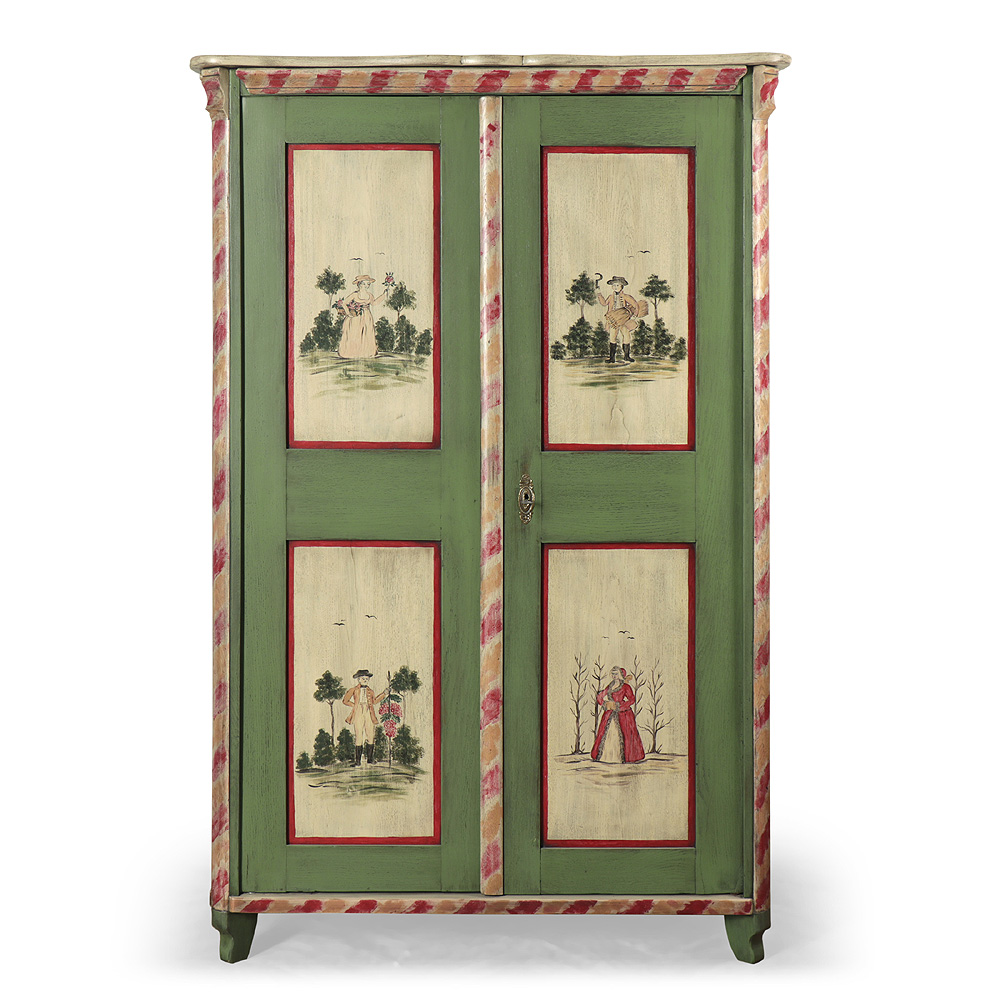 Dubová jednodveřová skříň s květinovou malbou. Šatní skříň z počátku 20. století vyrobená z masivního dubového dřeva, ručně opravená tradičními truhlářskými technologiemi. Dekorativní malba je provedena klasickým postupem – štětcem, vodovými barvami a patinováním. Finální povrchová úprava je dokončena transparentním ekologickým lakem. Česká výroba.